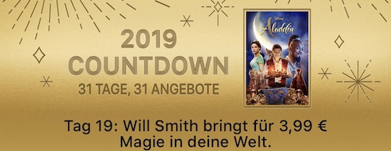 Das Weihnachtsfest rückt mal wieder näher und während sich bei manchen Freude und Besinnlichkeit breit macht, kommt bei anderen eher Hektik beim Weihnachtsshopping auf. Vor allem für Kinder bedeutet die Zeit bis zum Weihnachtsfest jeden Tag ein bisschen Freude beim Öffnen der Türen des Adventskalenders. Auch Apple bietet in diesem Jahr wieder eine Dezember-Aktion an und weitet diese gar auf 31 Tage, also bis zum Ende des Monats aus. Unter dem Motto "2019 Countdown - 31 Tage, 31 Angebote" wird man dabei jeden Tag mit einem neuen Inhalt aus dem Film-Bereich des iTunes Store zum Sonderpreis beschenkt. Heute erhält man auf diese Weise die aktuelle Komödie Aladdin mit Will Smith in der Rolle des Flaschengeistes für nur € 3,99 in HD-Qualität zu kaufen.