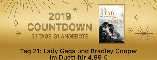 Das Weihnachtsfest rückt mal wieder näher und während sich bei manchen Freude und Besinnlichkeit breit macht, kommt bei anderen eher Hektik beim Weihnachtsshopping auf. Vor allem für Kinder bedeutet die Zeit bis zum Weihnachtsfest jeden Tag ein bisschen Freude beim Öffnen der Türen des Adventskalenders. Auch Apple bietet in diesem Jahr wieder eine Dezember-Aktion an und weitet diese gar auf 31 Tage, also bis zum Ende des Monats aus. Unter dem Motto "2019 Countdown - 31 Tage, 31 Angebote" wird man dabei jeden Tag mit einem neuen Inhalt aus dem Film-Bereich des iTunes Store zum Sonderpreis beschenkt. Heute erhält man auf diese Weise den oscarprämierten Film A Star is Born mit Bradley Cooper und Lady Gaga für nur € 4,99 in 4K HDR-Qualität zu kaufen.