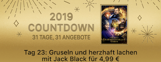 Das Weihnachtsfest rückt mal wieder näher und während sich bei manchen Freude und Besinnlichkeit breit macht, kommt bei anderen eher Hektik beim Weihnachtsshopping auf. Vor allem für Kinder bedeutet die Zeit bis zum Weihnachtsfest jeden Tag ein bisschen Freude beim Öffnen der Türen des Adventskalenders. Auch Apple bietet in diesem Jahr wieder eine Dezember-Aktion an und weitet diese gar auf 31 Tage, also bis zum Ende des Monats aus. Unter dem Motto "2019 Countdown - 31 Tage, 31 Angebote" wird man dabei jeden Tag mit einem neuen Inhalt aus dem Film-Bereich des iTunes Store zum Sonderpreis beschenkt. Heute erhält man auf diese Weise den Marvel-Blockbuster Das Haus der geheimnisvollen Uhren für nur € 4,99 in 4K HDR-Qualität zu kaufen.