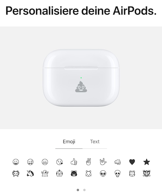 Die AirPods waren zu Weihnachten der heiße Scheiß. Vor allem die Pro-Variante war zeitweise kaum noch zu bekommen. Wer sich im Nachgang zu den Feiertage die kabellosen Kopfhörer noch bestellen möchte, hat nun eine weitere Möglichkeit zur Personalisierung ihrer AirPods, konkreter des Ladecases. Neben der bislang schon zur Verfügung stehenden Möglichkeit, das Case mit einem persönlichen Text gravieren zu lassen, steht hierfür nun auch eine Auswahl von 31 verschiedenen Emojis zur Verfügung, wenn man die AirPods über Apples Online Store erwirbt. Dies gilt ab sofort für alle verfügbaren AirPods-Modelle. Allerdings kann immer nur ein einzelnes Emoji gewählt und auch nicht Text mit Emojis kombiniert werden.
