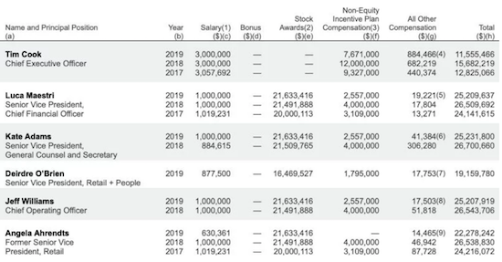 Wie jedes Jahr hat Apple auch Anfang 2020 nun wieder seinen Jahresbericht an die US-amerikanische Börsenaufsicht SEC übermittelt, wo er nun veröffentlicht wurde. Daraus geht unter anderem hervor, dass Apple CEO Tim Cook im vergangenen Jahr knapp über 11,5 Millionen US-Dollar an Gehalt erhalten hat. Dieses setzt sich zusammen aus seinem Grundgehalt von 3 Millionen Dollar, einem leistungsbezogenen Bonus in Höhe von 7,7 Millionen Dollar und 884.000 Dollar für sonstige Aufwendungen, wie Urlaubsgeld, Versicherungen, etc. Nicht enthalten sind Zahlungen in Form von Aktienpapieren, von denen Cook erst kürzlich eine beträchtliche Summe an einen gemeinnützigen Zweck gespendet hatte.