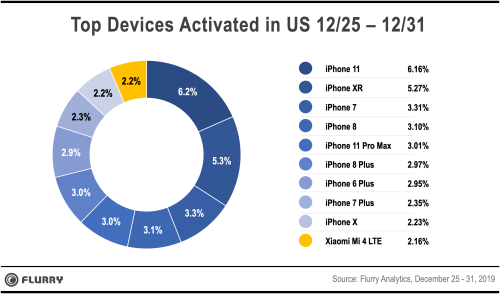 Nachdem sich Apple ja bereits im Kampf der beiden AppStores gegen die Android-Konkurrenz und den Google Play Store während der Weihnachtszeit durchsetzen konnte, soll dies auch bei den Smartphone-Aktivierungen der Fall gewesen sein. Dies jedenfalls legen die Zahlen von Flurry Analytics (via 9to5Mac) nahe, nach denen das Unternehmen mit dem iPhone 11, dem iPhone 11 Pro und diversen anderen Modellen (zumindest in den USA) mehr Aktivierungen als jeder andere Hersteller verzeichnen könnte. Im Zeitraum zwischen Weihnachten und Neujahr entfielen ca. 43% der Aktivierungen in den USA auf das iPhone und das iPad.
