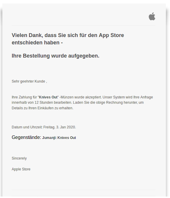 Auch in diesen Mails gibt es wieder verschiedene Hinweise auf die Betrugsmasche, wie beispielsweise eine fehlende namentliche Anrede oder auch die Grußformel "Sincerely, Apple Store", die Apple so ebenso niemals verwenden würde, wie derlei E-Mails zu verschicken.