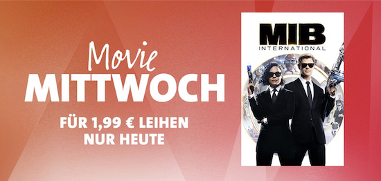 Auch heute hat Apple wieder den sogenannten "Movie Mittwoch" ausgerufen. Dabei wird jeden Mittwoch ein ausgewählter Film aus dem iTunes-Sortiment für 24 Stunden zum Sonderpreis von nur € 1,99 in 4K HDR-Qualität zum Leihen angeboten. Heute erhält man dabei den Blockbuster-Relaunch MIB: International mit Chris Hemsworth in der Hauptrolle. Nachdem man den Leih-Film geladen hat, kann er innerhalb von 30 Tagen angeschauen werden. Wie immer bei geliehenen Filmen aus dem iTunes Store gilt: Hat man hiermit einmal begonnen, muss man ihn innerhalb von 48 Stunden beenden.