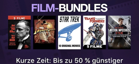 Nachdem Apple in der vergangenen Woche bereits eine Auswahl an 10 Film-Bundles um bis zu 50% vergünstigt in den iTunes Store gestellt hatte, geht es in dieser Woche in die zweite Runde. Mit dabei sind erneut einige Filme und Filmreihen, die aus meiner Sicht in keiner Sammlung fehlen sollte. Selbstverständlich kann man die Filme, wenn man sie einmal gekauft hat, so oft schauen wie man möchte und auch jederzeit erneut aus dem iTunes Store herunterladen oder streamen. Wer also aktuell noch ein wenig Video-Futter für die nach wie vor stürmischen Tage und/oder die restliche Winterzeit sucht, wird aktuell sicherlich in der folgenden Liste fündig.
