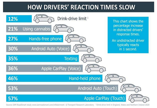Diese neue Studie des unabhängigen britischen Straßensicherheitsvereins IAM RoadSmart wird Apple sicherlich nicht gefallen. In der Studie wurde untersucht, welche Ablenkungen im Auto die Aufmerksamkeit und Reaktionsfähigkeit der Fahrer besonders stark negativ beeinflussen. Das Ergebnis: Die Touch-Bedienung von Apples CarPlay-Integration liegt an der Spitze der untersuchten Faktoren. Der Studie zufolge lenkt die Bedienung auf dem Touch-Display den Fahrer sogar deutlich mehr ab (57%), als beispielsweise das Schreiben einer Textnachricht (35%) oder das Fahren unter Drogen- (21%) oder Alkoholeinfluss (12%). Selbst die Sprachsteuerung von CarPlay hat mit 36% einen größeren Einfluss auf die Reaktionszeit der Fahrer als die beiden genannten Faktoren.