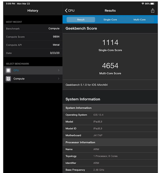 Im Geekbench 5 Test kommt das 11"-Modell des 2020er ?iPad Pro? auf einen Single-Core Wert von 1.114 Punkten und einen Multi-Core Wert von 4.654 Punkten. Zum Vergleich: Das direkte Vorgängermodell kommt durchschnittlich auf einen Single-Core Wert von 1.113 Punkten und einen Multi-Core Wert von 4.608 Punkten. Beide Chips besitzen acht Kerne, die mit 2.48 GHz getaktet sind. Bei der GPU hingegen kommt der A12Z-Chip auf acht Kerne gegenüber den sieben im A12X. Dies macht sich dann auch bei der Grafikleistung im Metal-Scores bemerkbar, wo es einen Anstieg auf 9.894 Punkte von bislang 9.020 Punkten gibt.