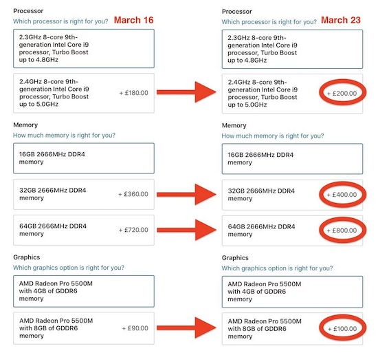Während der Aktualisierung des Apple Store, bei dem in der vergangenen Woche das neue MacBook Air, der neue Mac mini und das neue iPad Pro präsentiert wurden, hat Apple offenbar eine weitere, bislang unbemerkte Änderung vorgenommen, so hat man offenbar in verschiedenen Apple Stores auf der ganzen Welt die Preise für die sogenannten "Build-to-Order" Optionen, mit denen man die Standard-Macs nach eigenen Wünschen aufrüsten kann, um durchschnittlich 10% angehoben. Betroffen sind die Stores in Kanada, Europa, Australien und weiten Teilen von Asien, nicht jedoch der in den USA. Die Preiserhöhung betrifft sowohl das neue ?MacBook Air?, als auch das MacBook Pro, der iMac, iMac Pro, Mac Pro und der Mac mini. Die Kollegen von MacRumors liefern als Beispiel den unteren Vergleich aus dem Apple Store in Großbritannien mit.