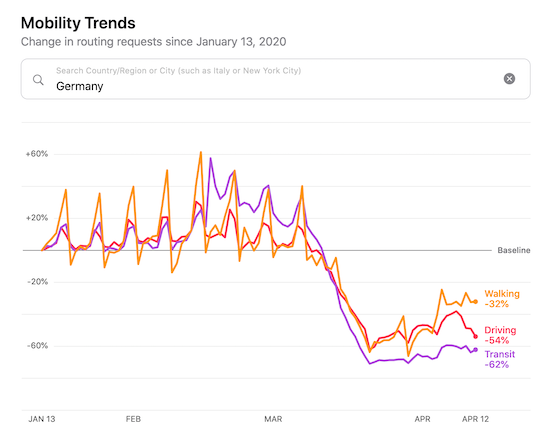 Dabei werden selbstverständlich keinerlei personalisierte oder einzelne Daten von Nutzern weitergegeben. Stattdessen aggregiert Apple auf einer Webseite die Daten sämtlicher Nutzer in großen Städten und 63 Ländern und Regionen. Die Daten stammen aus den Navi-Anfragen an Apples Karten-App. Auf diese Weise kann nachverfolgt werden, wie häufig sich die Nutzer bewegt haben und welche Entfernungen dabei zurückgelegt wurden. Zudem geht aus den Daten auch hervor, ob die Nutzer mit dem Auto, zu Fuß oder mit öffentlichen Verkehrsmitteln unterwegs waren.