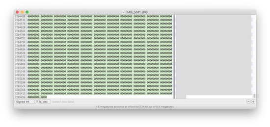Soweit, so gut. Das Problem ist jedoch, dass während dieser Konvertierung nun pro Foto 1,5 MB an nutzlosen Daten hinzugefügt werden, wodurch die Speicherbelegung der Fotos grundlos steigt. Nachdem sich die Entwickler von NeoFinder die Bilder in einem Hex-Editor angeschaut hatten, stellten sie fest, dass ein nur aus Nullen bestehender Bereich zu den konvertierten Fotos hinzugefügt wurden. Würde man also 1.000 Bilder von einem iPhone oder iPad importieren, hätte man auf einen Schlag ohne Grund oder Nutzen zusätzliche 1,5 GB an Speicher belegt.