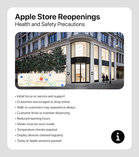 Ebenfalls wie auch in den anderen wiedereröffneten Stores weist Apple darauf hin, dass sich Besucher auf längere Wartezeiten als gewohnt und einen begrenzten Zutritt zum Store einstellen sollten. Zudem werden vorerst auch keine "Today at Apple" Sessions stattfinden.