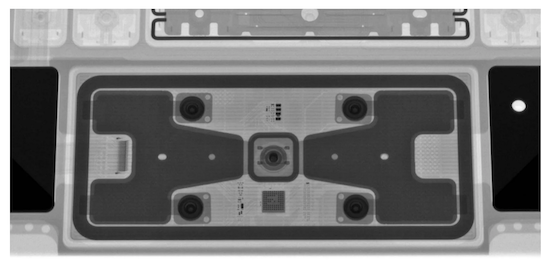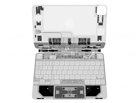 Auch das Gewicht des Magic Keyboard für das iPad Pro wird durch den Röntgenblick durchaus erklärt. So hat Apple rechts und links vom Trackpad offenbar zwei Metallplatten eingebaut, die vermutlich als Gegengewicht dienen. Das Trackpad selbst setzt offenbar auf mechanische Klicktasten und unterscheidet sich hierbei vom Force-Touch Trackpad der verschiedenen MacBooks, die bereits seit geraumer Zeit auf bewegliche Teile verzichten und stattdessen beim Klicken auf ein simuliertes, haptisches Feedback durch eine Art Taptic Engine setzen.