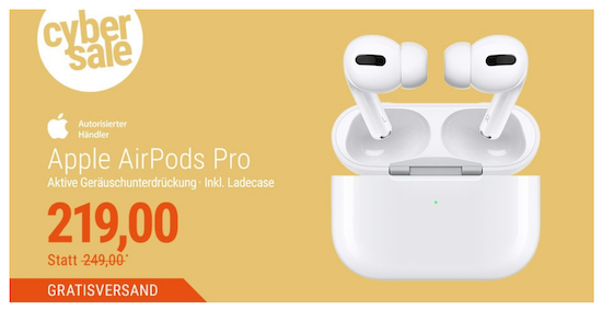 Ein ganz schneller Tipp für alle Kurzentschlossenen, die schon länger mit dem Kauf von Apples AirPods Pro liebäugeln, aber bislang aufgrund des vergleichsweise hohen Preises zurückgeschreckt sind. Aktuell kann man die AirPods Pro zum bisherigen Tiefstpreis von nur € 219,- im Cybersale bei Cyberport erstehen. Bei Interesse sollte man allerdings schnell sein. Die Aktion ist nicht nur zeitlich bis morgen früh um 09:00 Uhr begrenzt, sondern auch in der Stückzahl. Zum Zeitpunkt dieses Artikels sind nur noch gut 60 Stück verfügbar. Also, schnell sein. Der folgende Link führt direkt zum Angebot: AirPods Pro im Cybersale