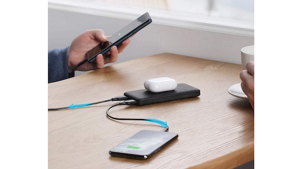 Bei einer Gesamtkapazität von 10.000 mAh erlaubt der PowerCore 10K Wireless das parallele Aufladen eines oder zweier Geräte mit 6 Watt an den beiden USB-A Anschlüssen, sowie mit 5 Watt über das auf der Oberseite der Powerbank angebrachte Qi-Ladepad. Ebenfalls gut: Der PowerCore Wireless untersützt das sogenannte "Pass-Through", wodurch man ein beliebiges Qi-fähiges Gerät auch dann laden kann, wenn die Powerbank selbst gerade zum Aufladen am USB-C Kabel hängt.