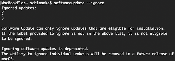 Die zweite Entdeckung bezieht sich zwar nicht auf die jüngste Version von macOS Catalina aber auf das Betriebssystem als solches. War es unter macOS 10.14 Mojave und macOS 10.13 High Sierra bis vor Kurzem noch möglich, die Hinweise auf verfügbare macOS-Updates auszublenden, wird dies von Apple nun verhindert. Dies gilt sowohl für macOS Catalina, als auch für Mojave und High Sierra mit den aktuellsten Sicherheitsupdates. Bislang war es möglich, das Badge mit der roten Eins am Dock-Icon der Systemeinstellungen über den Terminal-Befehl "softwareupdate --ignore" lauszublenden. Hierdurch entfiel dann allerdings auch der Hinweis auf die großen Systemupdates, die in der Regel im Herbst erscheinen. Laut Apple sei der Befehl "veraltet", worauf man im Changelog zu macOS Catalina 10.15.5 und auch inzwischen im Terminal bei seiner Eingabe hinweist. In einer künftigen macOS-Version werde er vollständig entfernt.