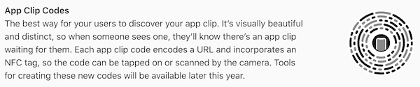 Für eine bessere Sichtbarkeit und ein eindeutiges Erkennen eines QR-Codes für einen "App Clip" hat Apple sogar ein eigenes Format für diese Codes entworfen. Hiervon verspricht man sich, dass Nutzer mittelfristig sofort erkennen, dass es sich um einen Code für einen "App Clip" handelt und ihn entsprechend nutzen. Selbstverständlich funktionieren aber auch herkömmliche QR-Codes ebenso wie entsprechend konfigurierte NFC-Tags, spezielle Banner auf Webseiten, Links in iMessage und Orten in Apples Karten App.