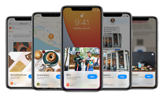 Eine weitere große Neuerung neben den neuen Widgets sind in iOS 14 die sogenannten "App Clips". Diese Funktion wurde auch schon einmal kurz im Vorfeld der WWDC thematisiert und sie hat sich tatsächlich bestätigt. Hierbei handelt es sich quasi um eine extrem abgespeckte Version einer App, die nur einer ausgewählten Funktion entspricht und die durch eine bestimmte Aktion getriggert wird. Dies kann beispielsweise das Abfotografieren eines entsprechenden QR-Codes oder auch das Scannen eines NFC-Tags sein. Geschieht dies, erscheint sofort eine Art Karte, die sich von unten auf das Display schiebt und dort die zugehörige App-Funktion zur Verfügung stellt. Alternativ kann der Nutzer auch direkt die komplette zugehörige App laden.