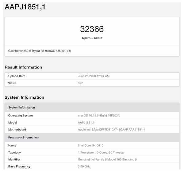 Die Benchmark-Ergebnisse eines bislang unbekannten iMac sind in der Geekbench-Datenbank gesichtet worden. Die Maschine ist mit einem Core i9 Intel Comet Lake-S Prozessor der 10. Generation und einer AMD Radeon Pro 5300 Grafikkarte ausgestattet und könnte der Nachfolger des aktuellen 27"-Modells sein, der nach wie vor für das laufende Jahr erwartet wird. Apple hatte auf der WWDC-Keynote ja bereits angekündigt, dass man vor dem endgültigen Wechsel auf das eigene "Apple Silicon" auch noch weitere Intel-Macs auf den Markt bringen wird. Der in dem gesichteten iMac verbaute Intel 3,6 GHz Core i9-10910 Chip kommt auf 10 CPU-Kerne, 20 Threads, einen 20MB L3 Cache und eine Taktrate von 4,7 GHz im Turbo Boost Modus. Die verwendete AMD Radeon Pro 5300 Grafikkarte wurde bislang noch gar nicht vorgestellt. Es dürfte sich dabei aber um die Desktop-Version der mobilen Radeon Pro 5300M Karte aus dem vergangenen Jahr handeln.