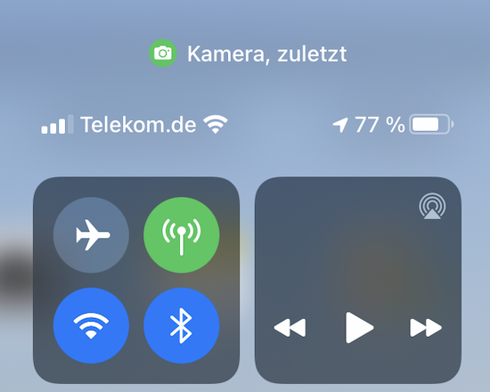 Der angesprochene grüne Punkt in der rechten oberen Ecke simuliert die vom Mac bekannte LED nun jedoch immerhin softwareseitig. Sie erscheint in der Tat, sobald eine App auf die Kamera zugreift und diese aktiv ist. Es handelt sich hierbei also um eine Sicherheitsfunktion, die Apple mit iOS 14 einführen wird. Zusätzlich zu dem eingeblendeten Punkt erscheint übrigens als weiteres Kontrollelement für den Nutzer auch im Kontrollzentrum ein Hinweis darauf, welche App zuletzt auf die Kamera zugegriffen hat.