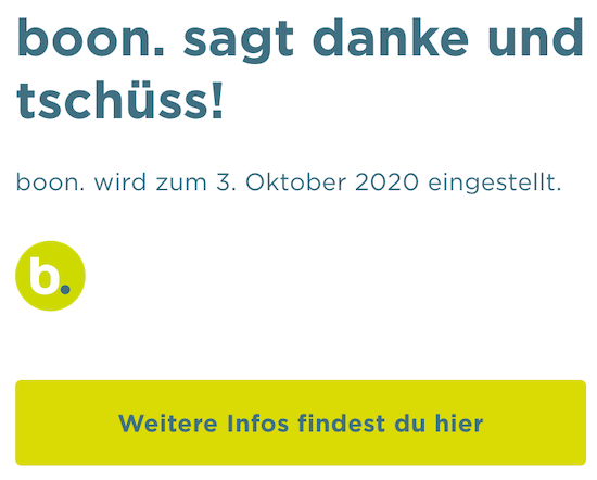 Wer aktuell noch Kunde von Boon ist, erhält in diesen Stunden eine E-Mail des Unternehmens, in der über das weitere Vorgehen informiert wird. Kurz zusammengefasst sind alle Nutzer gut beraten, ihre möglicherweise noch vorhandenen Guthaben möglichst kurzfristig auszugeben oder auf das eigene Bankkonto transferieren zu lassen.