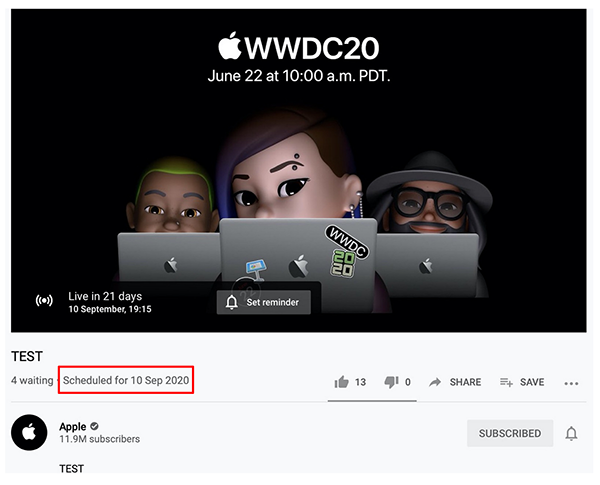 Wahrscheinlicher ist indes, dass es sich um einen reinen Platzhalter handelte, den Apple für den YouTube-Test verwendet hat. Möglicherweise hat man sich dabei auch des Datums des letztjährigen Events bedient, welches am Dienstag, den 10. September 2019 stattfand. In diesem Jahr fällt der 10. September hingegen auf einen Donnerstag, was ein mehr als ungewöhnlicher Tag für ein Apple-Event wäre.