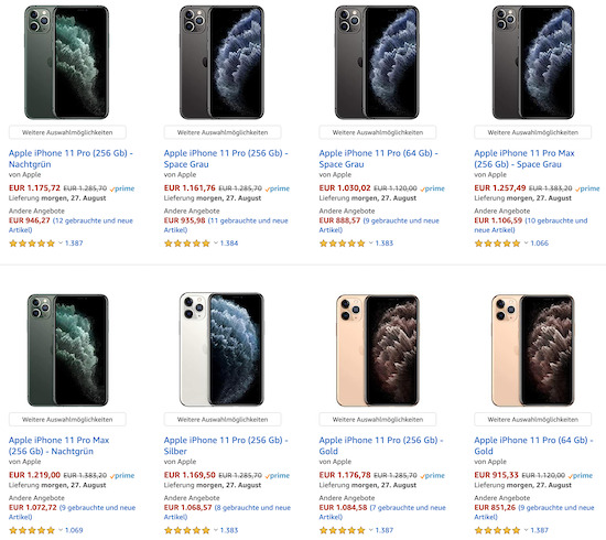 Laut Apple wird die neue iPhone-Generation in diesem Jahr "ein paar Wochen später" als gewohnt auf den Markt kommen. Dennoch nähern wir uns langsam aber sicher der Vorstellung der neuen Geräte und damit auch deren Markteinführung. Zeit also, die Lager mit den aktuellen Modellen zu leeren. Dies denkt sich aktuell vermutlich auch Amazon und reduziert sämtliche Modelle des iPhone 11 Pro im Preis. Teilweise kann man dabei sogar über € 200,- sparen, wenn man aktuell nicht auf das in Kürze anstehende iPhone 12 schielt. Der folgende Link führt zur Landingpage der iPhone-Aktion bei Amazon: iPhone 11 Pro und iPhone 11 Pro Max bei Amazon
