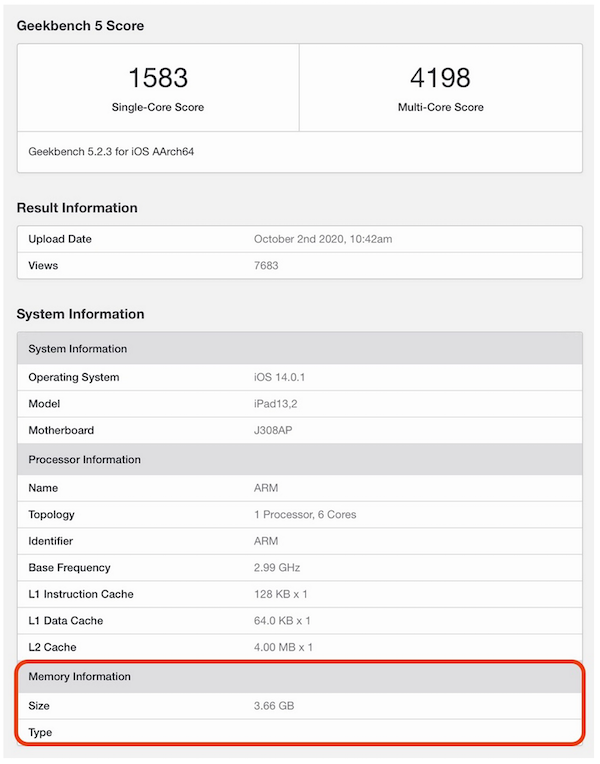 Am Wochenende waren bekanntermaßen erste Benchmarks in der Geekbench-Datenbank zu der Leistungsfähigkeit des A14 Bionic Chips aufgetaucht, den Apple erstmals im iPad Air 4, später dann wohl auch im iPhone 12 zum Einsatz bringen wird. Während allein die Leistungssteigerung durch den neuen Chip als beeindruckend zu bezeichnen ist, geht aus den Ergebnissen noch ein weiteres Detail hervor, welches bis jetzt untergegangen war. So wird das neue iPad Air mit 4 GB Arbeitsspeicher ausgestattet sein, wenn es in diesem Monat in den Verkauf geht.