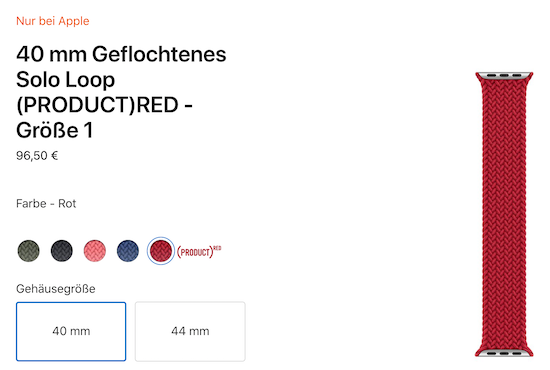 Als Apple die Apple Watch Series 6 im vergangenen Monat vorstellte, präsentierte man bei dieser Gelegenheit mit dem Solo Loop und Braided Solo Loop auch zwei neue Armbänder für die Watch, die ihne irgendeinen Verschlussmechanismuss auskommen. Mit dabei war auch eine PRODUCT(RED) Variante der beiden Bänder, die allerdings nicht sofort verfügbar war. Dies hat sich nun geändert und man kann die beiden Bänder in der roten Farbe nun im Apple Online Store bestellen unda bei auch gleich noch etwas Gutes tun.