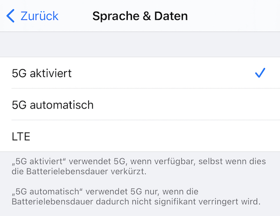 Bedenken sollte man zudem, dass Apple für 5G den sogenannten "Smart Data Mode" entwickelt hat, der automatisch von 5G auf LTE wechselt, um Akku zu sparen, wenn keine superschnelle Verbindung benötigt wird. Auch hier kann man eingreifen. Die entsprechenden Optionen finden sich ebenfalls in den Einstzellungen unter dem Punkt "Mobiles Netz > Datenoptionen > Sprache & Daten".
