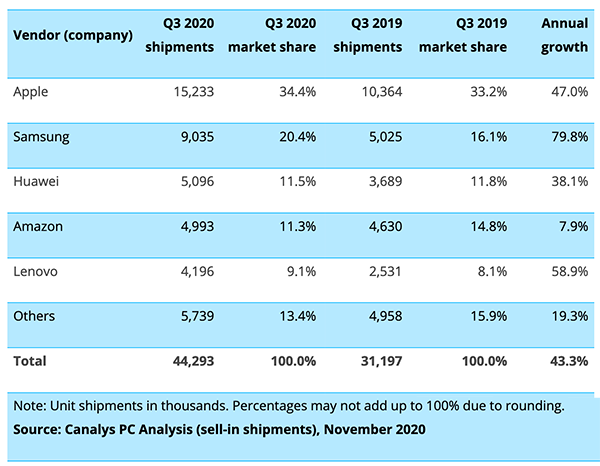 Insgesamt konnte der gesamte Tablet-Markt coronabedingt im dritten Quartal gegenüber dem Vorjahr um 43,3% zulegen.