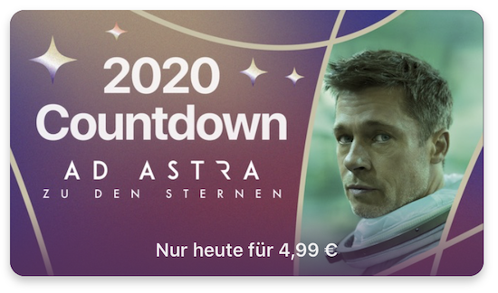 Das Weihnachtsfest rückt mal wieder näher und während sich bei manchen Freude und Besinnlichkeit breit macht, kommt bei anderen eher Hektik beim Weihnachtsshopping auf. Vor allem für Kinder bedeutet die Zeit bis zum Weihnachtsfest jeden Tag ein bisschen Freude beim Öffnen der Türen des Adventskalenders. Auch Apple bietet in diesem Jahr wieder eine Dezember-Aktion an und weitet diese gar auf 31 Tage, also bis zum Ende des Monats aus. Unter dem Motto "2020 Countdown" wird man dabei jeden Tag mit einem neuen Inhalt aus dem Film-Bereich des iTunes Store zum Sonderpreis beschenkt. Heute erhält man auf diese Weise den aktuellen Blockbuster Ad Astra - Zu den Sternen mit Brad Pitt und Tommy Lee Jones für nur € 4,99 zu kaufen.