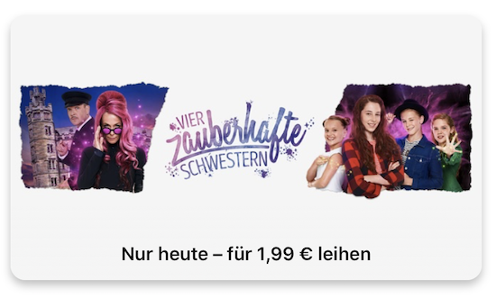Auch heute hat Apple wieder den sogenannten "Movie Mittwoch" ausgerufen. Dabei wird jeden Mittwoch ein ausgewählter Film aus dem iTunes-Sortiment für 24 Stunden zum Sonderpreis von nur € 1,99 in HD-Qualität zum Leihen angeboten. In dieser Woche handelt es sich um den deutschen Kinderfilm Vier zauberhafte Schwestern den man zum Sonderpreis von € 1,99 erhält. Nachdem man den Leih-Film geladen hat, kann er innerhalb von 30 Tagen angeschaut werden. Wie immer bei geliehenen Filmen aus dem iTunes Store gilt: Hat man hiermit einmal begonnen, muss man ihn innerhalb von 48 Stunden beenden.