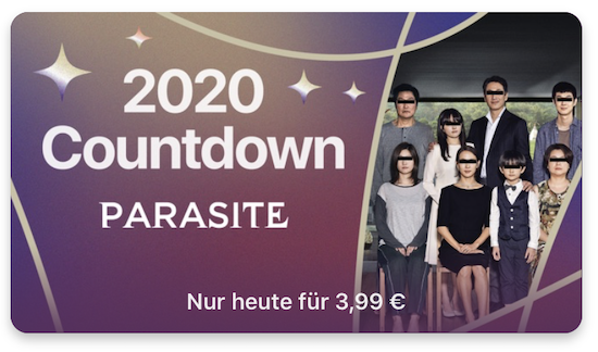 Das Weihnachtsfest rückt mal wieder näher und während sich bei manchen Freude und Besinnlichkeit breit macht, kommt bei anderen eher Hektik beim Weihnachtsshopping auf. Vor allem für Kinder bedeutet die Zeit bis zum Weihnachtsfest jeden Tag ein bisschen Freude beim Öffnen der Türen des Adventskalenders. Auch Apple bietet in diesem Jahr wieder eine Dezember-Aktion an und weitet diese gar auf 31 Tage, also bis zum Ende des Monats aus. Unter dem Motto "2020 Countdown" wird man dabei jeden Tag mit einem neuen Inhalt aus dem Film-Bereich des iTunes Store zum Sonderpreis beschenkt. Heute erhält man auf diese Weise den oscarprämierten Blockbuster Parasite für nur € 3,99 zu kaufen.