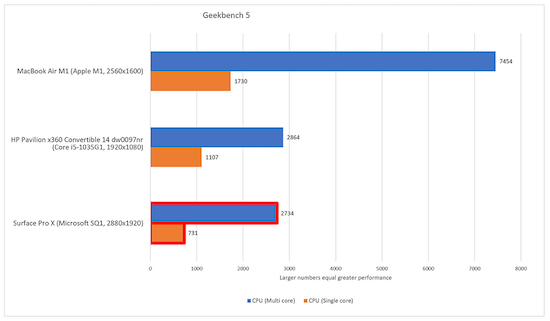 Apple hingegen hatte sich bereits im vergangenen Jahr mit macOS Catalina komplett von 32-Bit Apps entschieden und in diesem Jahr mit macOS Big Sur Rosetta 2 eingeführt. Mit dieser Technologie lassen sich für Intel-Macs entwickelte Apps unter Apple Silicon ausführen. Wie gut dies funktioniert, ist in den neuen Benchmarks deutlich abzulesen. Zwar hat auch Microsoft kürzlich eine erste Beta von Windows veröffentlicht, die 64-Bit Software für die x86-Architektur emuliert, die Leistungsunterschiede sind jedoch nach wie vor deutlich. In einem Geekbench 5 Test ließ das M1 MacBook Air das Surface Pro X deutlich hinter sich. Auch ein billiger HP Pavilion Laptop mit Intel Core i5 Prozessor war noch schneller.