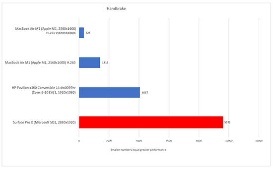 In einem weiteren Test wurde gemessen, wie lange es dauert, ein 12 Minuten langes 4K Video mit der Video-Umwandlungssoftware HandBrake in das 1080p H.265 Format umzuwandeln. Während das MacBook Air hierfür ca. 23 Minuten benötigte, rechnete das Surface Pro X ARM satte 2 Stunden, um den Vorgang abzuschließen.