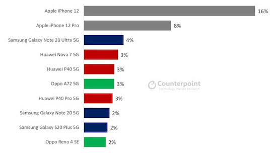 Dass das iPhone 12 ein absoluter Verkaufsschlager für Apple ist, ist nicht neu. Belegt wird dieser Eindruck nun noch einmal durch aktuelle Zahlen der Analysten von Counterpoint Research, die ermittelt haben, dass Apples aktuelle iPhone-Generation das am besten verkaufte 5G-Smartphone im Monat Oktober war - und das obwohl das Gerät sich in jenem Monat gerade einmal teilweise vorbestellen ließ. Aufgeteilt in die beiden Modelle iPhone 12 und iPhone 12 Pro konnte ersteres 16% des weltweiten Smartphonemarkts ergattern, während das Pro-Modell auf weitere 8% kam. Dem iPhone am nächsten kam das Samsung Galaxy Note 20 Ultra 5G mit 4%. Komplettiert werden die Top 10 von zwei weiteren Samsung-Geräte, drei Huawei-Smartphones und zwei Oppo-Modellen.