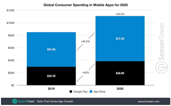Erst kürzlich hatten die AppStore-Analysten von Sensor Tower ihre Erkenntnisse aus dem zurückliegenden Weihnachtsgeschäft veröffentlicht und dabei ermittelt, dass (wohl vor allem aufgrund der Corona-Pandemie) es hier ein Wachstum von 34,5% im Jahresvergleich gegeben hat. Nun haben die Analysten ihren vollständigen Bericht zum Jahr 2020 veröffentlicht. Auch hier gab es wie zu erwarten vor dem Hintergrund von Home-Office und Home-Schooling einen großen Anstieg von 30% im Vergleich zum Vorjahr. Laut Sensor Tower gaben Nutzer von Apple-Geräten in 2020 weltweit eine neue Rekordsumme von 72 Milliarden US-Dollar aus.