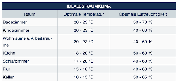 Empfohlen wird eine Luftfeuchtigkeit in Innenräumen, die der folgenden Tabelle entnommen werden kann (Quelle: Luftfeuchtigkeit-Raumklima.de):