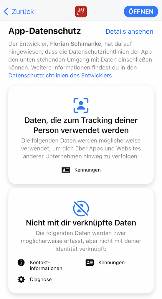 Als weitere Maßnahme hat Apple die AppStore-Entwickler inzwischen dazu verpflichtet, Formulare zum Thema Datenschutz und Tracking innerhalb ihrer Apps auszufüllen. Die daraus gewonnenen Informationen werden inzwischen auch als Labels auf den Seiten der jeweiligen Apps im AppStore angezeigt. Auch diese Anzeige fehlt derzeit noch bei den prominenten Google-Apps.