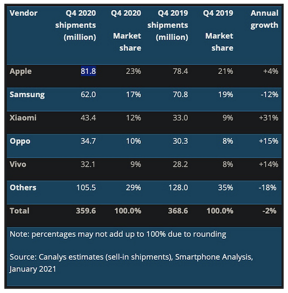 Dank eines außergewöhnlich starken Weihnachtsgeschäfts hat Apple sich im vergangenen Quartal die Krone der weltweit größten Smartphone-Hersteller gesichert und damit die Konkurrenz von Samsung und Huawei in die Schranken gewiesen. Beide Hersteller mussten teils herbe Rückgänge hinnehmen, wie aus aktuellen Zahlen von Canalys hervorgeht. Demnach hat Apple im letzten Quartal des Jahres 2020 mit 81,1 Millionen mehr iPhones an den Mann gebracht als je zuvor (die Analysten von IDC sehen hier sogar knapp 10 Millionen Geräte mehr). Samsung hingegen konnte "nur" 62 Millionen Smartphones verkaufen, was einem Rückgang von 12% im Jahresvergleich entspricht. Noch schlimmer sah es bei Huawei aus, die sogar von den chinesischen Konkurrenten von Xiaomi, Oppo und Vivo aus den Top 5 verdrängt wurden. Alle drei Hersteller konnten ihre Anteile sogar noch deutlich stärker steigern als Apple. Die Analysten sehen vor allem in der starken Nachfrage nach dem iPhone 12 einen wesentlichen Faktor für den Erfolg Cupertinos.