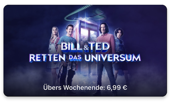 Darüber hinaus lässt sich die überarbeitete Version des 80er Jahre Klamauks Bill & Ted retten das Universum mit Keanu Reeves nur über das Wochenende zum Preis von € 6,99 käuflich im iTunes Store erwerben. Einmal gekaufte Filme lassen sich jederzeit erneut aus dem iTunes Store herunterladen und sind auf allen verbundenen Geräten uneingeschränkt nutzbar.