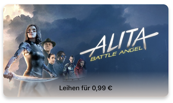 Apple hat zusätzlich zu seinem bereits liebgewonnenen "Movie Mittwoch" nun auch den "Blockbuster fürs Wochenende" ins Leben gerufen. Dabei wird jedes Wochenende ein ausgewählter Film aus dem iTunes-Sortiment für 24 Stunden zum Sonderpreis von nur € 0,99 in HD-Qualität zum Leihen angeboten. In dieser Woche handelt es sich um das Action-Spektakel Alita: Battle Angel mit Christoph Waltz und Jennifer Connelly den man zum Sonderpreis von € 0,99 erhält. Nachdem man den Leih-Film geladen hat, kann er innerhalb von 30 Tagen angeschaut werden. Wie immer bei geliehenen Filmen aus dem iTunes Store gilt: Hat man hiermit einmal begonnen, muss man ihn innerhalb von 48 Stunden beenden.