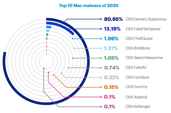 Die Anti-Virus-Spezialisten von Malwarebytes haben ihren aktuellen "State of Malware" Bericht veröffentlicht, aus dem vor allem die Entwicklungen in Sachen Viren- und Malwareverbreitung im vergangenen Jahr hervorgehen. Erneut zeigt sich, dass der Mac nach wie vor eine vergleichsweise sichere Plattform ist. Den Zahlen zufolge waren die Gefahren durch Schadsoftware auf dem Mac im vergangenen Jahr sogar um 38% rückläufig. Wurden von Malwarebytes im Jahr noch insgesamt 120.855.305 Gefahren gesichtet, waren es in 2020 "nur" noch 75.285.427.