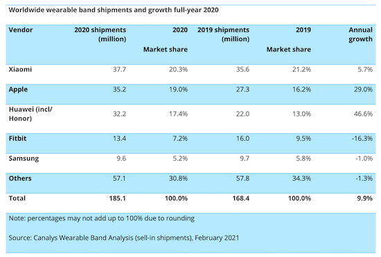 Auch die Apple Watch legte mit insgesamt 35,2 Millionen verkaufter Geräte ein ausgesprochen starkes Jahr hin. Da in diese Kategorie allerdings auch günstige Fitness-Armbänder einfließen, schloss nicht Apple, sondern Xiaomi sie auf Platz 1 mit 37,7 Millionen verkaufter Geräte ab. Auch hier war das vierte Quartal für die Apple Watch mit einem Wachstum um knapp 50% im Jahresvergleich auf 14,5 Millionen Geräte und einen Marktanteil von 25% besonders stark.
