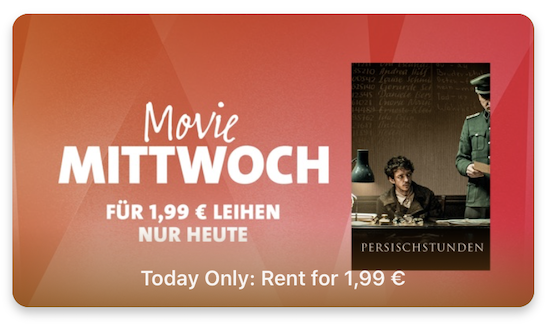 Auch heute hat Apple wieder den sogenannten "Movie Mittwoch" ausgerufen. Dabei wird jeden Mittwoch ein ausgewählter Film aus dem iTunes-Sortiment für 24 Stunden zum Sonderpreis von nur € 1,99 in HD-Qualität zum Leihen angeboten. In dieser Woche handelt es sich dabei um das Drama Persischstunden, das man zum Sonderpreis von € 1,99 erhält. Nachdem man den Leih-Film geladen hat, kann er innerhalb von 30 Tagen angeschaut werden. Wie immer bei geliehenen Filmen aus dem iTunes Store gilt: Hat man hiermit einmal begonnen, muss man ihn innerhalb von 48 Stunden beenden.