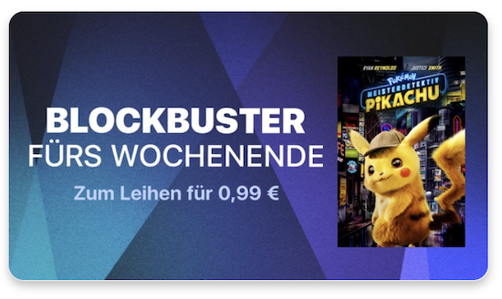 Apple hat zusätzlich zu seinem bereits liebgewonnenen "Movie Mittwoch" nun auch den "Blockbuster fürs Wochenende" ins Leben gerufen. Dabei wird jedes Wochenende ein ausgewählter Film aus dem iTunes-Sortiment für 24 Stunden zum Sonderpreis von nur € 0,99 in HD-Qualität zum Leihen angeboten. In dieser Woche handelt es sich um die Action-Komödie Pokémon: Meisterdetektiv Pikachu mit Ryan Reynolds, die man zum Sonderpreis von € 0,99 erhält. Nachdem man den Leih-Film geladen hat, kann er innerhalb von 30 Tagen angeschaut werden. Wie immer bei geliehenen Filmen aus dem iTunes Store gilt: Hat man hiermit einmal begonnen, muss man ihn innerhalb von 48 Stunden beenden.