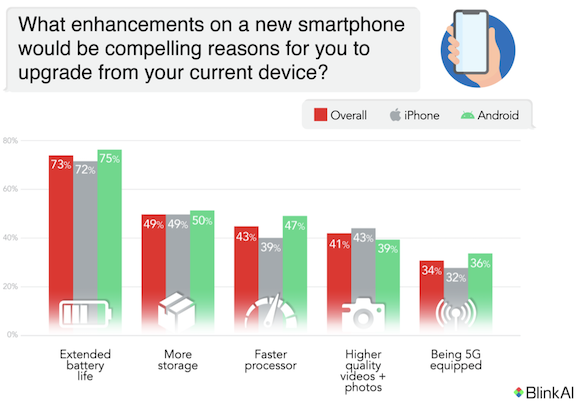 Keine Frage, die Aushänge-Funktion des iPhone 12 ist die erstmalig in einem iPhone zur Verfügung stehende Unterstützung des 5G-Mobilfunkstandards. Allerdings muss man wohl festhalten, dass diese Funktion von vielen Nutzern aufgrund des mangelnden Netzausbaus noch gar nicht vollumfänglich genutzt werden kann. Interessant ist in diesem Zusammenhang auch eine aktuelle Umgfrage von BlinkAI unter 1.000 US-Amerikanern, welche Funktionen ihnen bei ihrem Smartphone am wichtigsten sind. Herausgekommen ist dabei unter anderem, dass den meisten Nutzern vor allem eine längere Akkulaufzeit wichtig wäre, während 5G keine besonders hohe Priorität genießt. So landeten beispielsweise auch noch mehr Speicherplatz, ein schnellerer Prozessor und ein besseres Kamerasystem vor der Unterstützung von 5G. Vor allem iPhone-Nutzer können offenbar auf 5G verzichten.