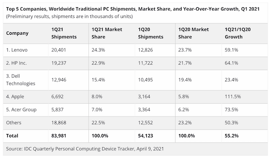 Schon im vergangenen Jahr konnte der Mac deutlich zulegen, was nicht zuletzt auch an der gestiegenen Nachfrage nach Computern aufgrund von Home-Office und Home-Schooling gelegen hat. Dieser Trend setzte sich auch im ersten Quartal 2021 fort, wie aktuelle Daten der Analysten von IDC belegen. Demnach konnte der Mac in den ersten drei Monaten des Jahres um satte 111,5% gegenüber dem Vorjahresquartal zulegen. Unter den großen PC-Herstellern konnte Apple damit am stärksten wachsen. Damit reiht sich der Mac in den Trend des gesamten PC-Marktes ein, der ebenfalls im Jahresvergleich wuchs. Den Daten zufolge hat Apple im ersten Quartal ca. 6,7 Millionen Macs verkauft, was 8% des gesamten Marktes entspricht. Im ersten Quartal 2020 hatte Apple noch 3,2 Millionen Macs verkauft.