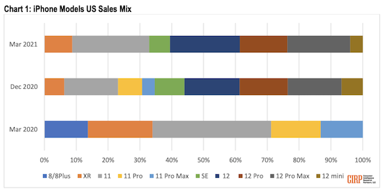 Das iPhone 12 verkauft sich auch weiterhin wie geschnitten Brot. Dies geht aus aktuellen Zahlen der Analysten von Consumer Intelligence Research Partners hervor. Demnach machten die Modelle aus Apples aktueller iPhone-Reihe 61% aller in den USA verkauften iPhones im ersten Quartal 2021 aus. Von den iPhone 12 Modellen war dabei das Standard iPhone 12 das meistverkaufte Gerät, gefolgt vom iPhone 12 Pro Max, dem iPhone 12 Pro und dem iPhone 12 mini. Den größten Anteil für ein einzelnes Modell konnte allerdings nach wie vor das iPhone 11 mit 24% für sich reklamieren. Erneut war das iPhone 12 mini das sich am schlechtesten verkaufende iPhone im zurückliegenden Quartal und wurde sogar vom iPhone SE und iPhone XR geschlagen.