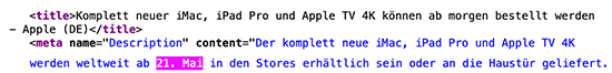 Und dann hat Apple quasi auch noch selbst das Datum verraten. Schaut man sich den Quelltext der heute veröffentlichten Pressemitteilung zum morgigen Verkaufsstart auf den Apple-Webseiten an, steht dort in den Meta-Daten wörtlich: "Der komplett neue iMac, iPad Pro und Apple TV 4K werden weltweit ab 21. Mai in den Stores erhältlich sein oder an die Haustür geliefert." Interessant ist dabei, dass Apple das Datum in der Pressemitteilung mit keinem Wort erwähnt, die Information aber in den Metadaten ersichtlich ist.